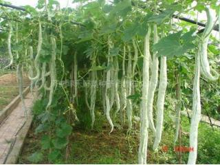 蛇瓜, 蛇丝瓜,蛇豆 蛇瓜又名蛇豆、蛇丝瓜,原产于印度、马来西亚等亚洲热带地区,是一年生攀缘植物,葫芦科栝楼属,雌雄同株。瓜条一般长1米以上,直径3~5厘米,或曲或伸,颜色和形状酷似一条蛇,故名蛇瓜。其瓜形奇特,观赏期可达3个月,是观光农业难得的好品种,蛇瓜是夏秋淡季蔬菜市场新的特色品种,是一种观赏、食用俱佳的蔬菜。