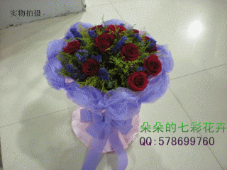 花材:精选红玫瑰11枝+加拿大黄莺+紫色勿忘我点缀+粉色绉纹纸多层束绕+紫色纱网外围+紫色棉丝带打蝴蝶结 花语:那天,是我生命中最美丽的一天,我们相遇.从此,生命中的美丽期然而至,一生幸福快乐……