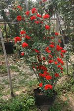 绿化新秀——藤本月季,攀援生长型,根系发达,抗性极强,枝条萌发迅速,长势强壮,一株年萌发主枝7—8个,每个主枝又呈开放性分枝,年最高长势可达5米,具有很强的抗病害能力。管理粗放、耐修剪、花型丰富、四季开花不断,花色艳丽、奔放、花期持久、香气浓郁。花色有朱红、大红、鲜红、粉红、金黄、橙黄、复色、洁白等,二年生节间发芽,全身开花、花头众多,可形成花球、花柱、花墙、花海、拱门形、走廊形等景观。