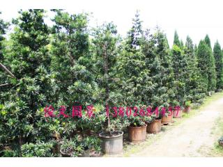 1、小叶罗汉松(Podocarpus macrophyllus (Thunb.) Sweet. var. maki Siev. & Zucc.),又称雀舌罗汉松、雀舌松、短叶土杉,呈灌木状,叶短而密生,多着生于小枝顶端,背面有白粉。