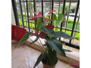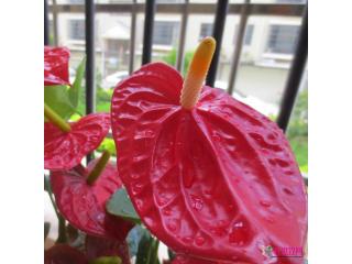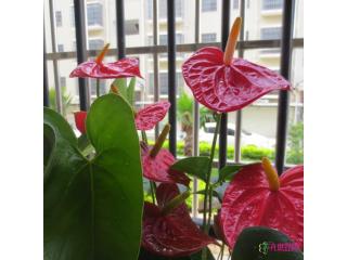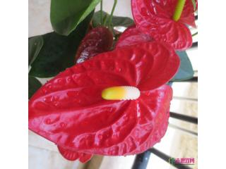 红掌(anthurium)又名安祖花、火鹤花等,属天南星科花烛属。原产于南美洲的热带雨林地区 ,现欧洲、亚洲、非洲皆有广泛栽培。特性是喜暖畏寒,喜湿怕旱,喜阴忌晒。其花朵独特,有佛焰花序,色泽鲜艳华丽,色彩丰富,叶形苞片,常见的苞片颜色有红色、粉红、白色等,有极大的观赏价值。可用播种、分株等法繁殖。红掌的花语是大展宏图、热情、热血。