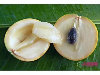 黄金果口感介于洋香瓜和芒果之间,甜度可达14度,含有丰富蛋白质、碳水化合物、纤维、钙、磷、铁及多种维他命等。果肉乳白色半透明,未熟果有涩味,成熟后甜而具芳香,带有微粘之乳汁,呈半透明胶质状,甜度12-15度之间,果肉含水份74﹪,种子1-4枚,夏季果实自开花至采收需60-70天,冬季果实生长期可达80天。
