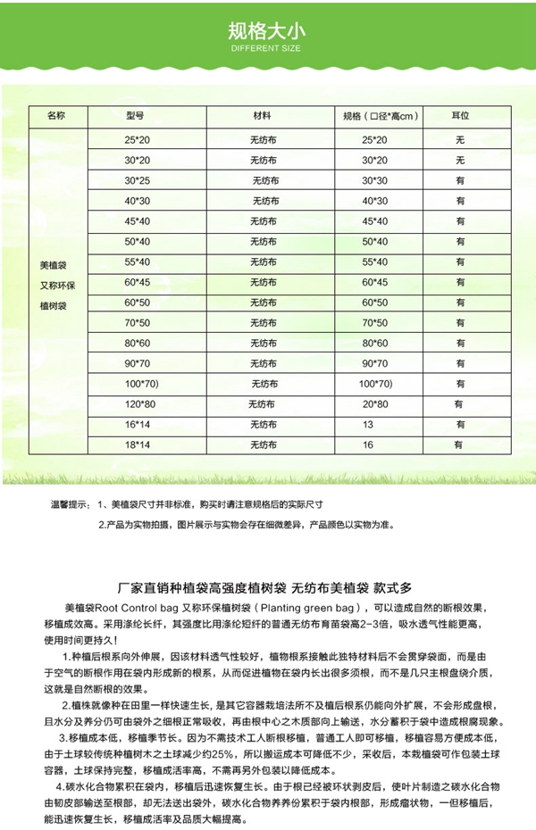 采用涤纶长纤,其强度比用涤纶短纤的普通无纺布育苗袋高2-3倍,吸水透气性能更高,使用时间更持久!
