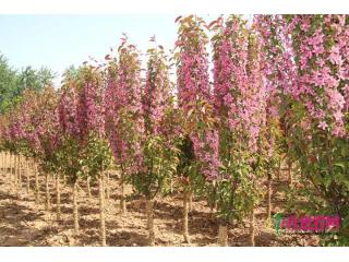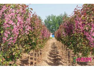 美国海棠为落叶小乔木,株高一般在2.5-5米,树型上由开展型到紧凑型、垂枝型;分枝多变,互生直立悬垂等无弯曲枝。树干颜色为新干棕红色,黄绿色,老干灰棕色,有光泽,观赏性高。叶色上由绿色到红色、紫色或先红后绿,可谓色彩斑斓;花型上由过去的野生种单瓣浅色变为深色、多色、重瓣,色彩绚丽,花量之大,令人叹为观止。谢花后珍珠般果实挂在枝头,有的可至雪降,极具观赏价值。