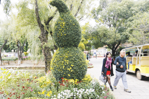 美丽神秘的云岭高原,山水秀美,气候宜人,资源丰富,被誉为植物和动物的“王国”。沿着公园主游路右侧的一条小路前行,便可看到一组名为“彩云之南”的造型菊,活泼的大象、美丽的孔雀、可爱的熊猫、灵动的海豚等立体造型菊花,憨态可掬,萌翻了游客。