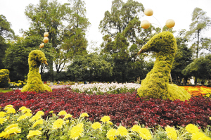 散落在菊海中的各式各样的造型菊成为历届菊展主打的景观之一。经过多年的发展,公园内的造型菊景观已由最初简单的平面造型菊发展为可360度观看的立体造型菊,制作耗费的人力、精力、时间也比以往增加了不少。
